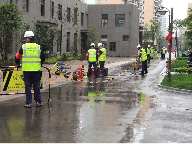 當天下午15時30分,公司調度中心接到報警:迎江府小區(qū)地下管道遭施工方破壞,造成天然氣泄漏,需緊急處理。接到報警后,安慶港華維搶人員立即驅車趕至現(xiàn)場,依據(jù)預案要求,各就各位地迅速展開應急搶險工作:探漏組仔細檢測事發(fā)區(qū)域周邊的燃氣數(shù)值;警戒組對泄漏點上風向30米、下風向50米處進行警戒,并疏散周邊圍觀群眾及車輛;搶修組立即確定遭破壞管徑及搶險物資,并上報現(xiàn)場情況。