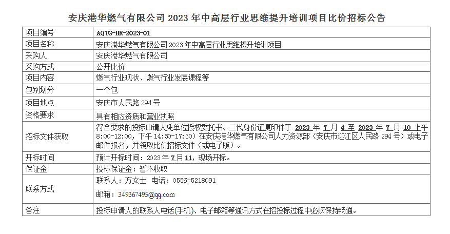 安慶港華燃氣有限公司2023年中高層行業(yè)思維提升培訓(xùn)項目比價招標(biāo)公告