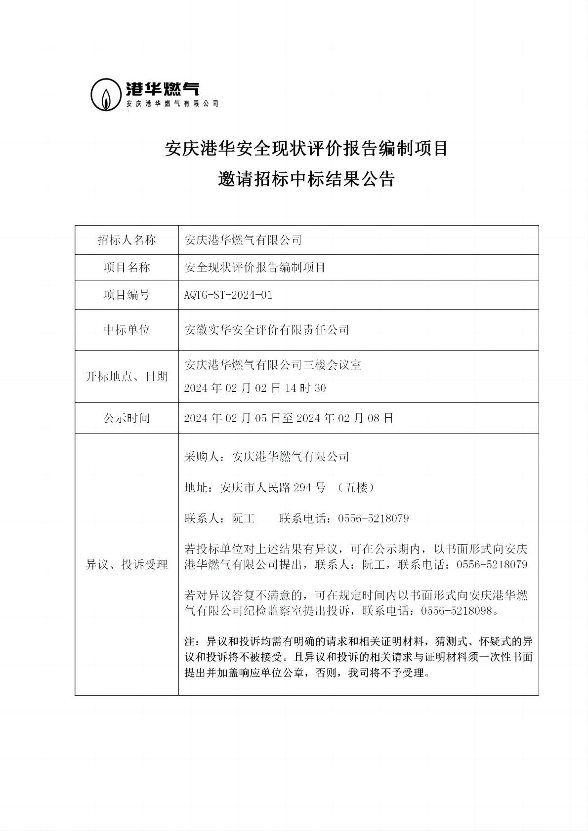 安慶港華安全現(xiàn)狀評價報告編制項目邀請招標(biāo)中標(biāo)結(jié)果公告 發(fā)布時間:2024-02-05    閱讀次數(shù):3717次