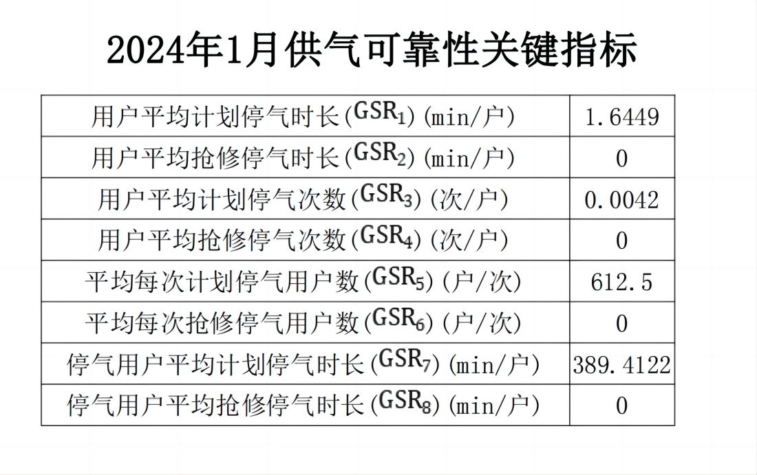 2024年1月供氣可靠性關(guān)鍵指標