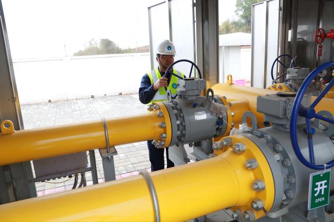 12時(shí)08分,置換作業(yè)開始。確定管道內(nèi)氣體成分比例符合要求后,置換組緩慢開啟1號(hào)閥門,向管網(wǎng)內(nèi)輸送天然氣,并由調(diào)度中心對(duì)管網(wǎng)內(nèi)壓力情況跟進(jìn)、監(jiān)測(cè)。正午時(shí)分,驕陽似火,檢測(cè)人員們一邊吃著盒飯一邊堅(jiān)守施工現(xiàn)場(chǎng)觀測(cè)數(shù)據(jù)。終于,14時(shí)16分,現(xiàn)場(chǎng)調(diào)度的對(duì)講機(jī)內(nèi)傳來放散塔檢測(cè)人員的聲音:“經(jīng)檢測(cè),管網(wǎng)內(nèi)燃?xì)夂恳堰_(dá)99.7%,置換合格?!?