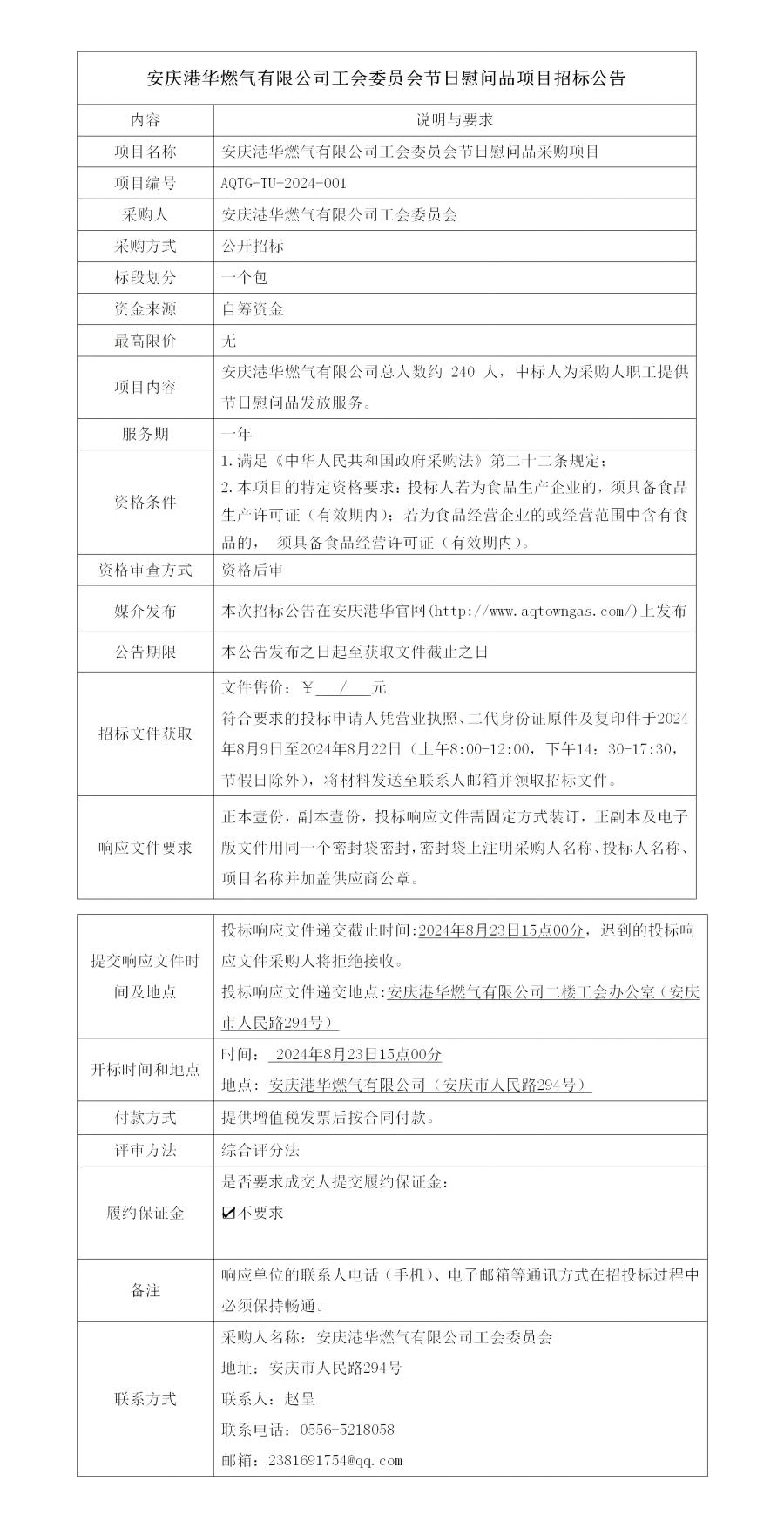 安慶港華燃?xì)庥邢薰竟?huì)委員會(huì)節(jié)日慰問(wèn)品項(xiàng)目招標(biāo)公告 發(fā)布時(shí)間:2024-08-09    閱讀次數(shù):2900次