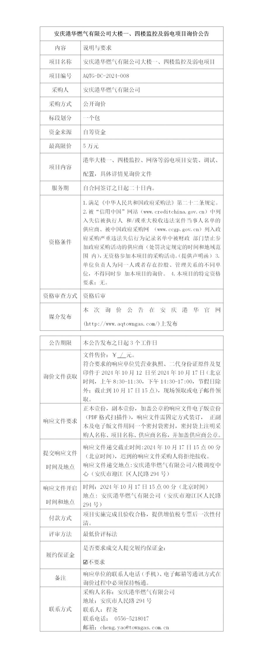 安慶港華燃氣有限公司大樓一、四樓監(jiān)控及弱電項目詢價公告