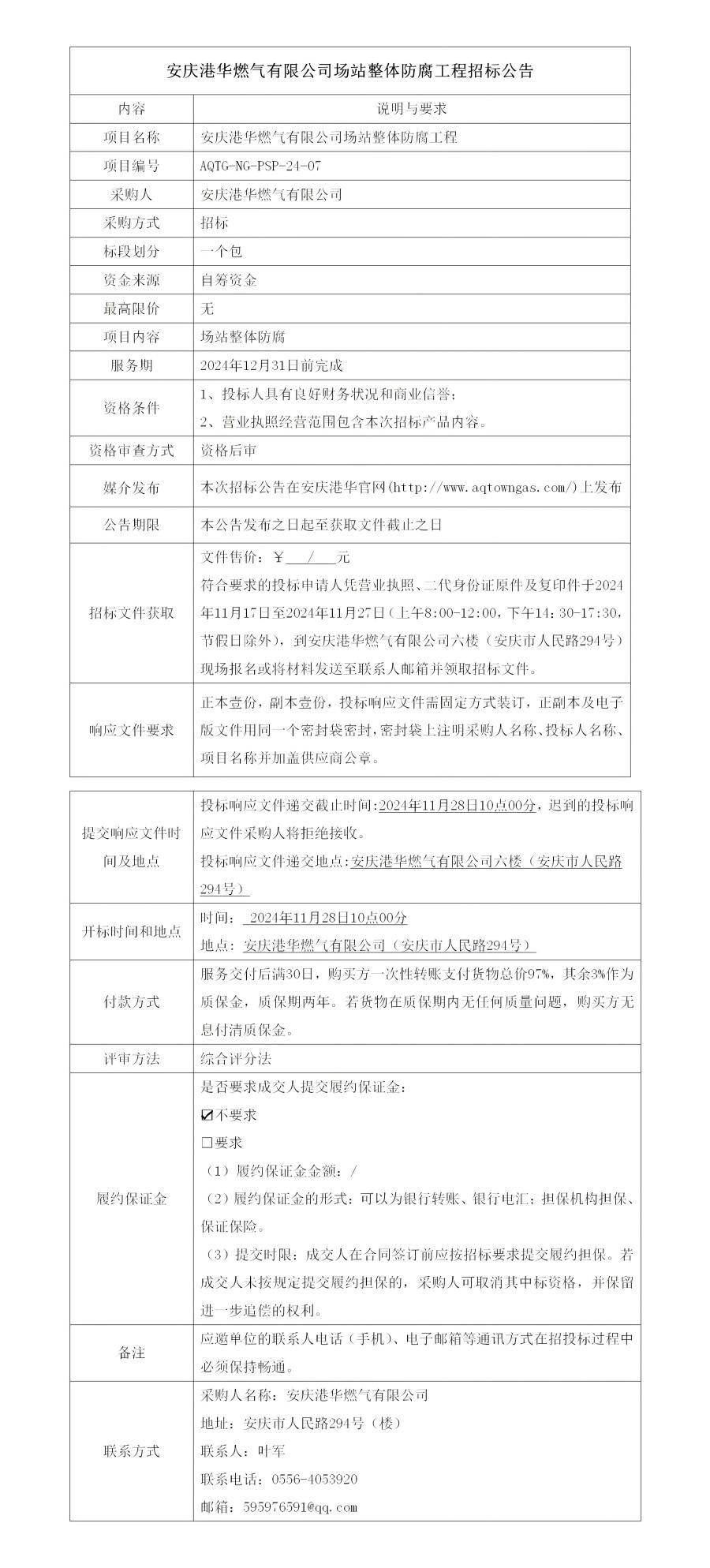 安慶港華燃氣有限公司場站整體防腐工程招標公告