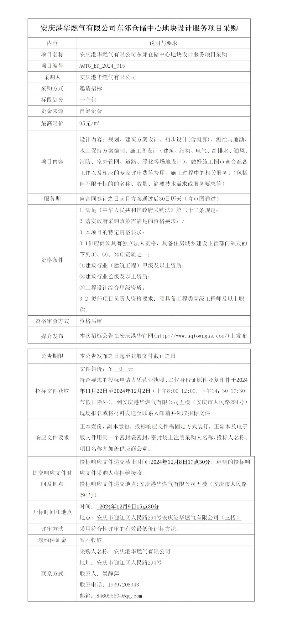 安慶港華燃氣有限公司東郊倉儲中心地塊設計服務項目采購