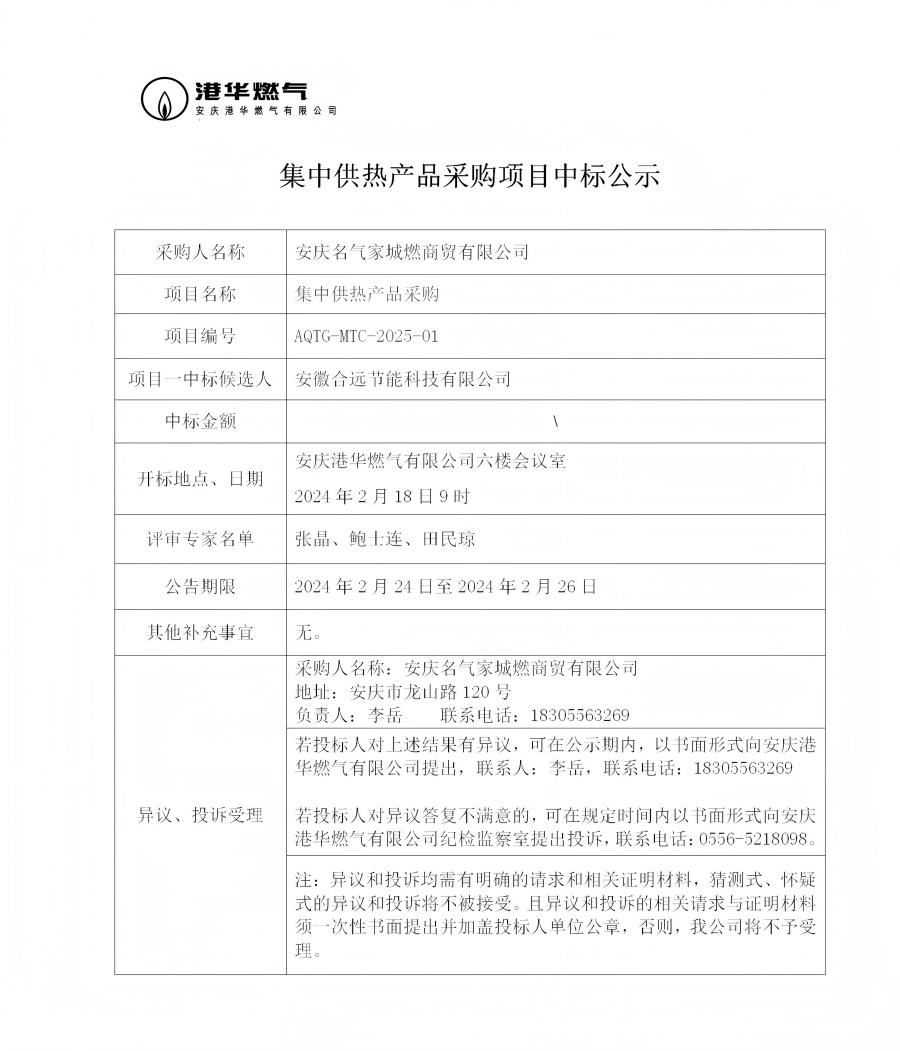 集中供熱產(chǎn)品采購項目中標(biāo)公示