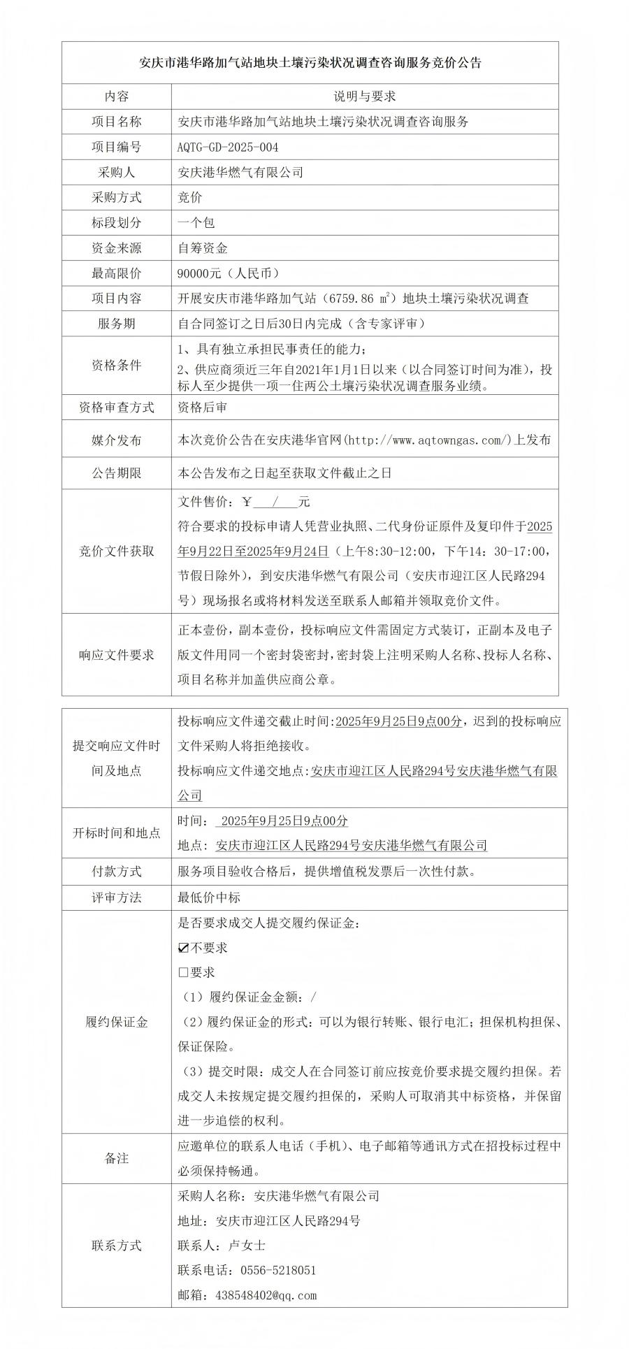 安慶市港華路加氣站地塊土壤污染狀況調(diào)查咨詢服務(wù)競價公告