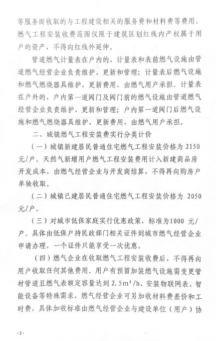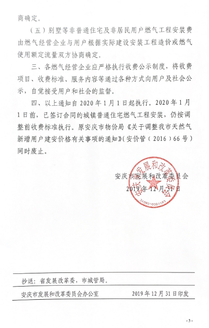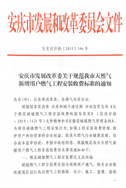 安慶市發(fā)展改革委關(guān)于規(guī)范我市天然氣新增用戶燃?xì)夤こ贪惭b收費標(biāo)準(zhǔn)的通知(2019)